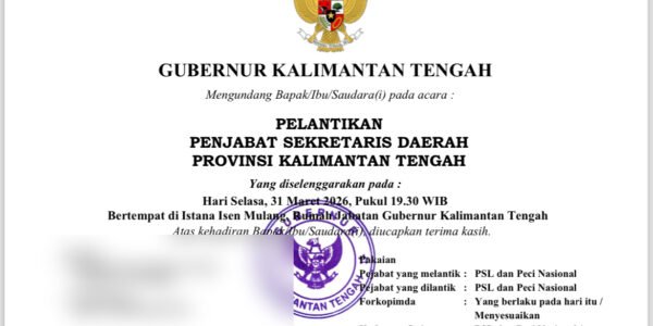 Palangka Raya/Pradanamedia – Suasana birokrasi Pemerintah Provinsi Kalimantan Tengah memasuki babak baru. Pada Selasa malam, 31 Maret 2026, Gubernur Kalteng Agustiar Sabran secara resmi akan melantik Sekretaris Daerah Provinsi Kalimantan Tengah dalam sebuah prosesi di Istana Isen Mulang, Kota Palangka…