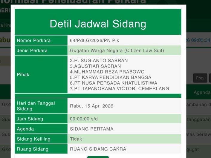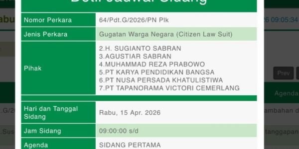 Palangka Raya, Pradanamedia – Ruang Sidang Cakra di Pengadilan Negeri Palangka Raya tak sekadar menjadi tempat perkara berjalan, tetapi juga panggung uji konsistensi pejabat publik terhadap prinsip hukum. Rabu, 15/4/2026, sidang perdana gugatan warga negara (citizen lawsuit) dengan nomor 64/Pdt.G/2026/PN…