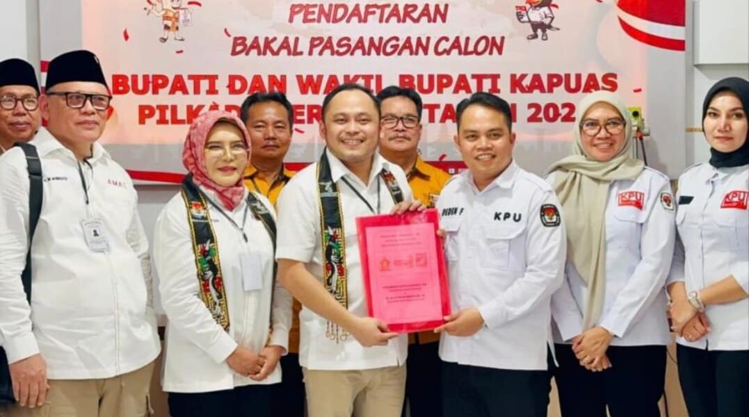 Kapuas – Diiringi ratusan simpatisan dari Partai Gerindra, PSI, dan Hanura, Alfian Mawardi bersama istrinya serta Agati Sulie yang didampingi sang suami, H. Mahyudin, resmi mendaftarkan diri sebagai bakal calon Bupati dan Wakil Bupati Kapuas periode 2024-2029. Tepat pukul 14.00 WIB, mereka tiba di Kantor KPU Kapuas di Jalan Tambun Bungai.