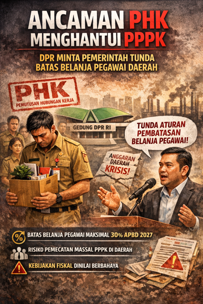 JAKARTA/PRADANAMEDI – Kebijakan pembatasan belanja pegawai di daerah mulai memicu kekhawatiran luas. Ribuan Pegawai Pemerintah dengan Perjanjian Kerja (PPPK) di berbagai wilayah terancam kehilangan pekerjaan jika aturan tersebut diberlakukan tanpa penyesuaian kebijakan.