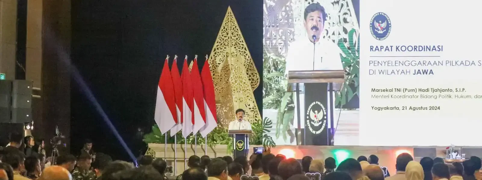 “Menko Polhukam Hadi Tjahjanto menegaskan pentingnya peningkatan koordinasi antara Pemerintah Pusat dan Daerah untuk menyukseskan pelaksanaan Pilkada 2024. Dalam Rapat Koordinasi Penyelenggaraan Pilkada Serentak Tahun 2024 yang digelar di Yogyakarta pada Rabu (21/8), Menko Hadi menggarisbawahi bahwa sinergi antara berbagai pihak sangat krusial untuk memastikan semua tahapan Pilkada dapat berjalan sesuai dengan regulasi dan ketentuan yang berlaku.