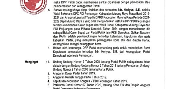 Murung Raya – Heriyus M Yoseph, Wakil Ketua DPC Partai Demokrasi Indonesia Perjuangan (PDIP) Murung Raya masa bakti 2019-2024, resmi dipecat dari keanggotaan partai. Keputusan ini tertuang dalam surat dari DPP PDIP nomor 1612/KPTS/DPP/X/2024. Dalam surat tersebut, Heriyus diduga melanggar…
