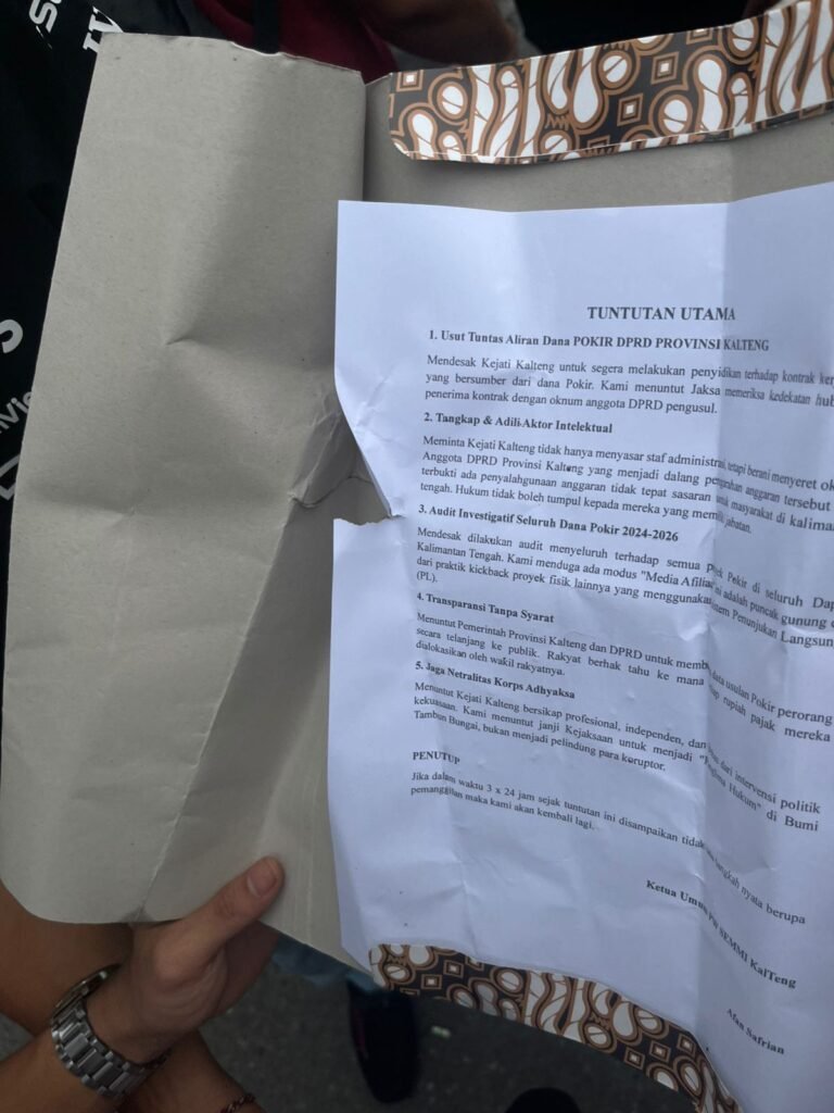 Koordinator lapangan aksi, Afan, menyampaikan sejumlah tuntutan utama kepada pihak kejaksaan. Salah satunya mendesak aparat untuk menelusuri aliran dana Pokir yang diduga bermasalah serta membuka hubungan antara pihak penerima proyek dengan oknum anggota DPRD pengusul kegiatan.