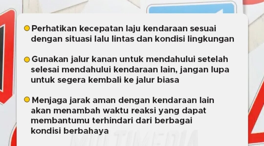 • Jaga Jarak Aman Selalu jaga jarak aman dengan kendaraan di depan Anda. Hal ini sangat penting, terutama di jalan tol atau saat cuaca buruk, untuk memberi ruang cukup jika terjadi hal tak terduga.
