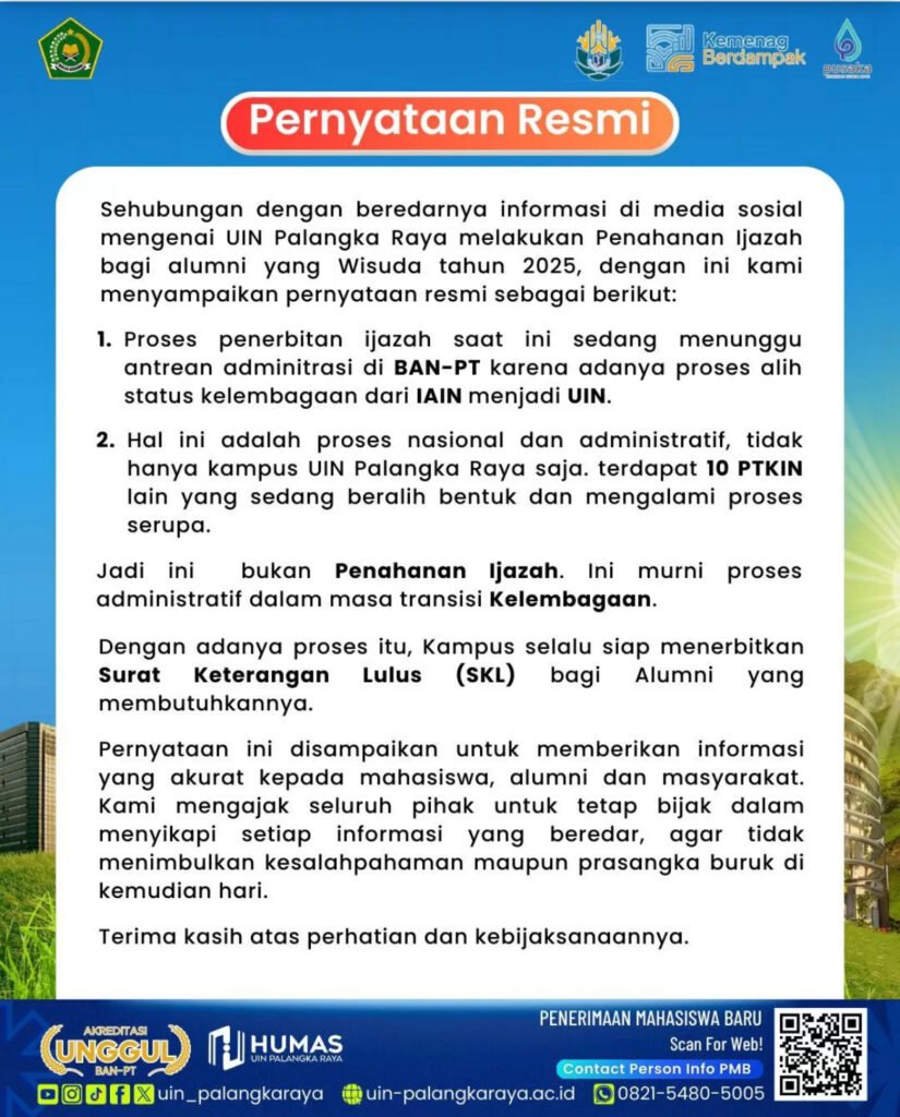 Selama proses tersebut belum rampung dan penomoran ijazah nasional belum diterbitkan, dokumen ijazah belum dapat dicetak secara resmi. Kampus pun menyebut proses ini tidak hanya dialami UIN Palangka Raya, tetapi juga sejumlah perguruan tinggi lain yang mengalami perubahan bentuk kelembagaan pada periode yang sama.